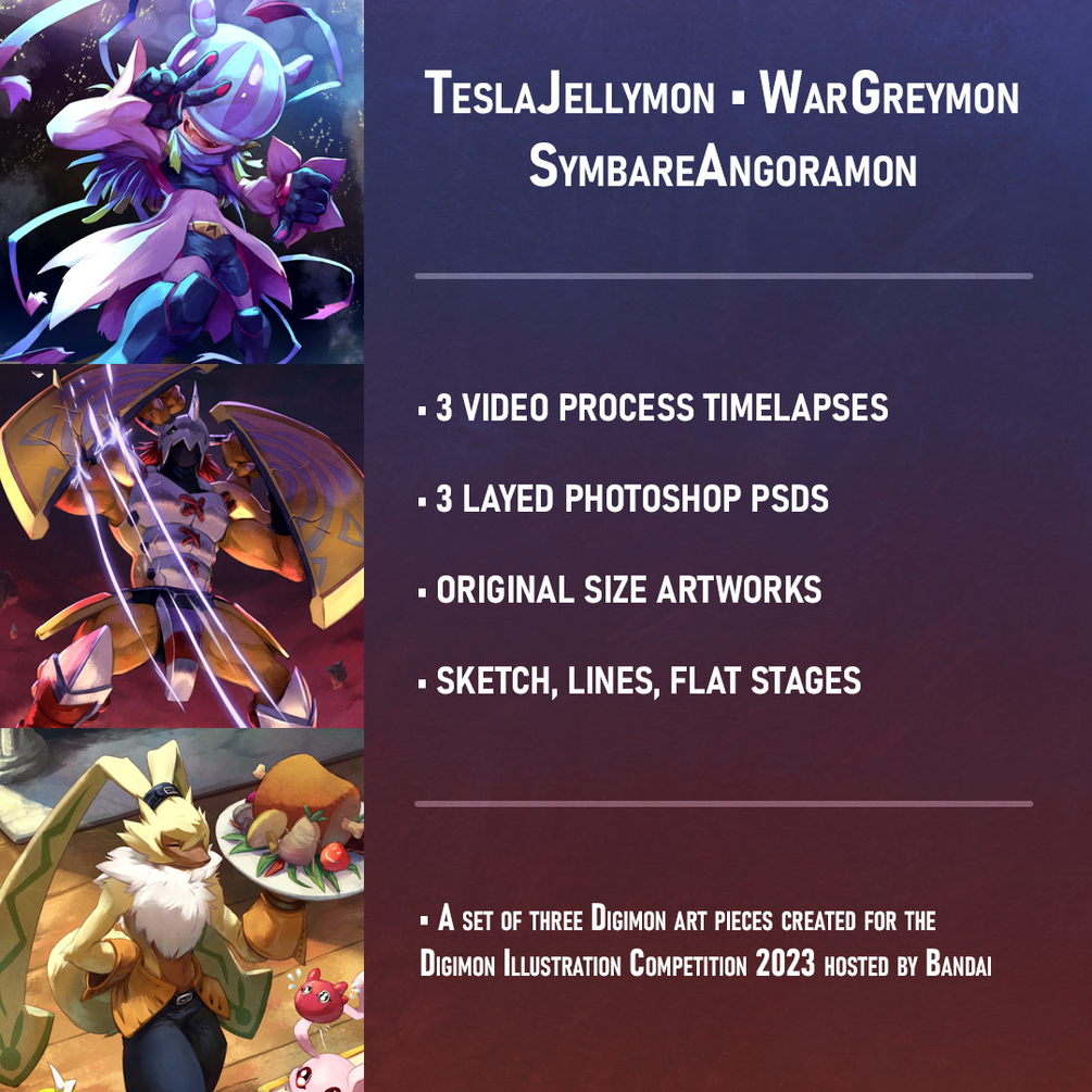 A set of three Digimon art pieces created for the Digimon Illustration Competition 2023, hosted by Bandai!